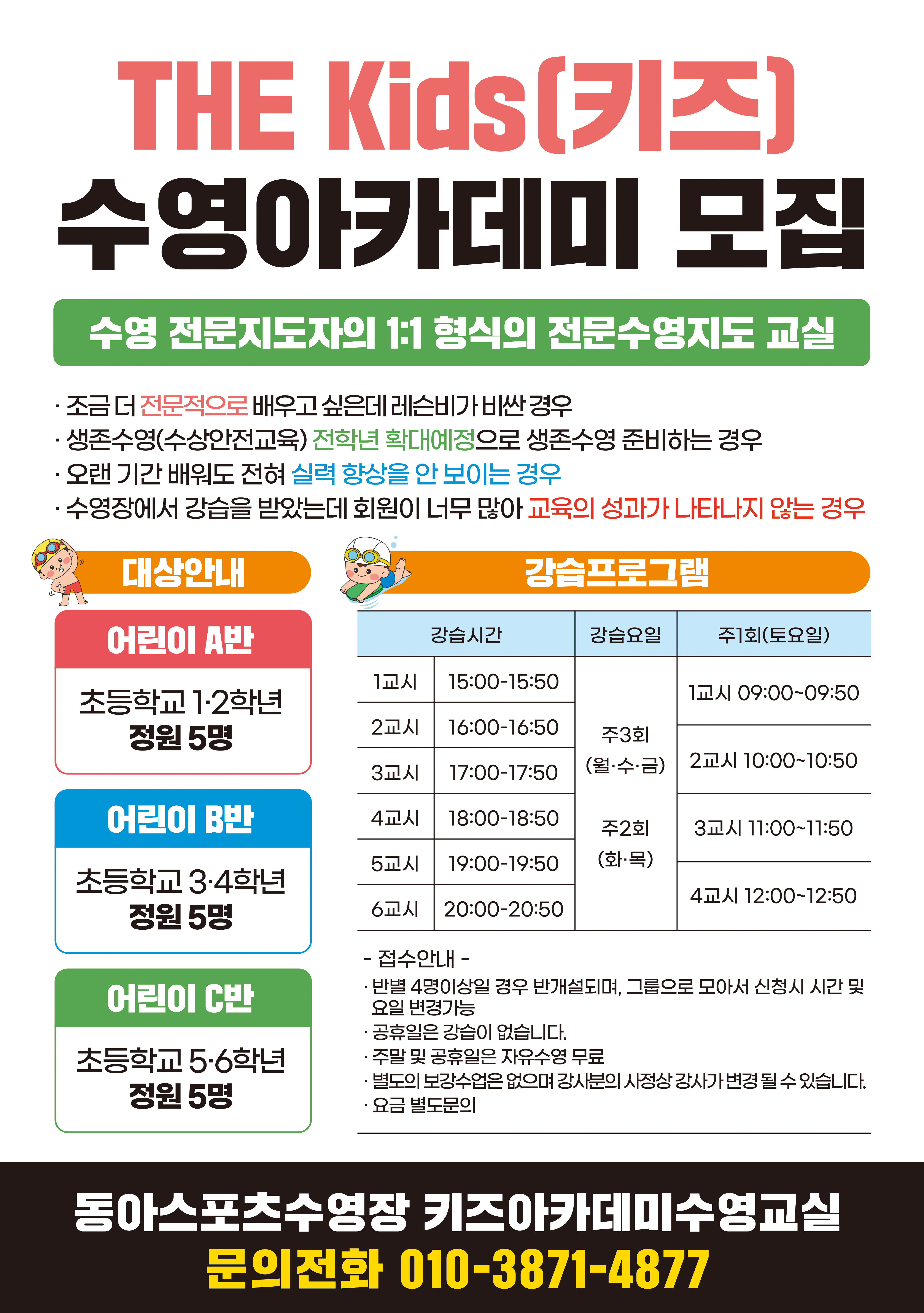 동아스포츠수영장 키즈수영 아카데미가 개설되었습니다.