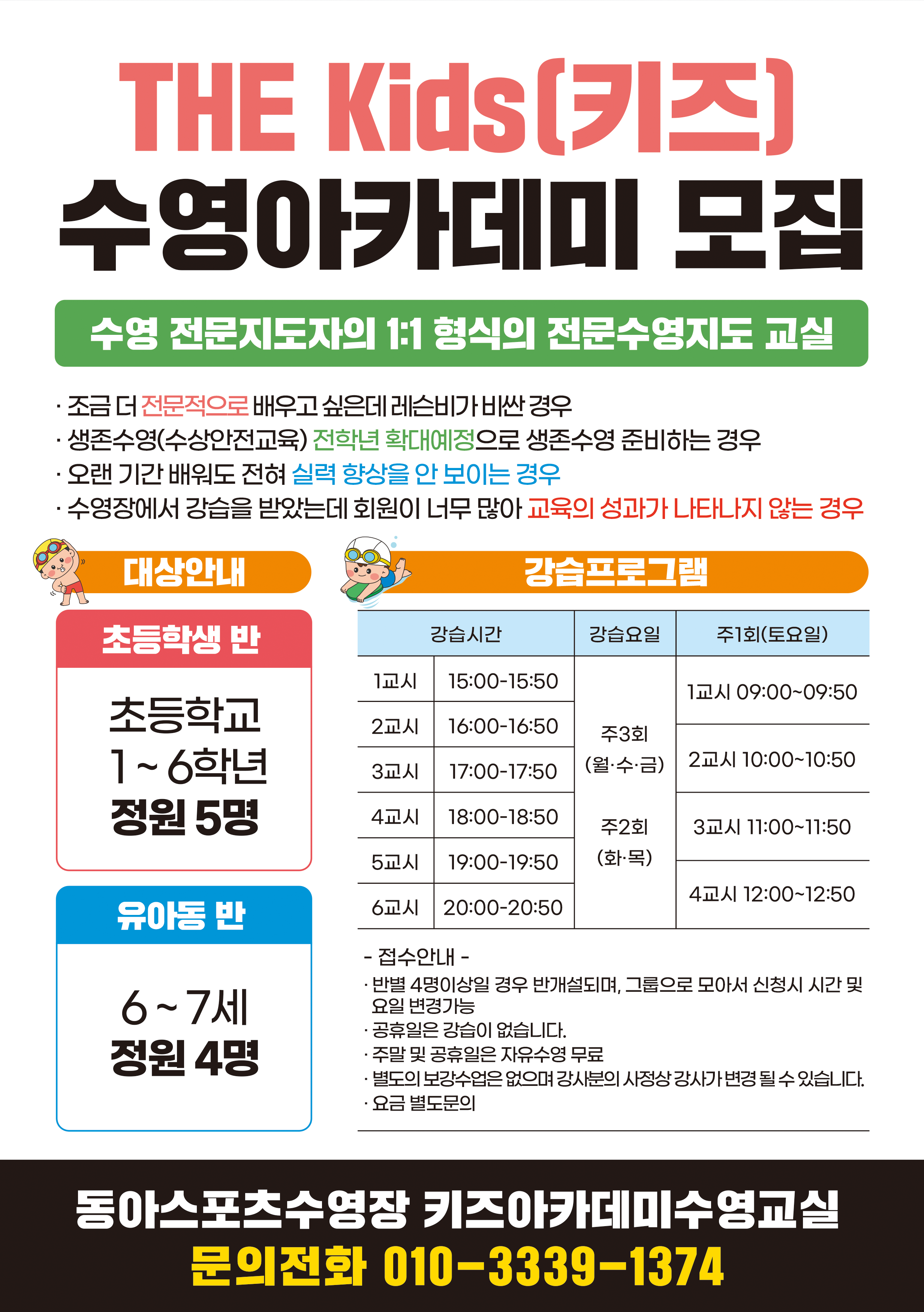 동아스포츠수영장 키즈수영 아카데미가 개설되었습니다.