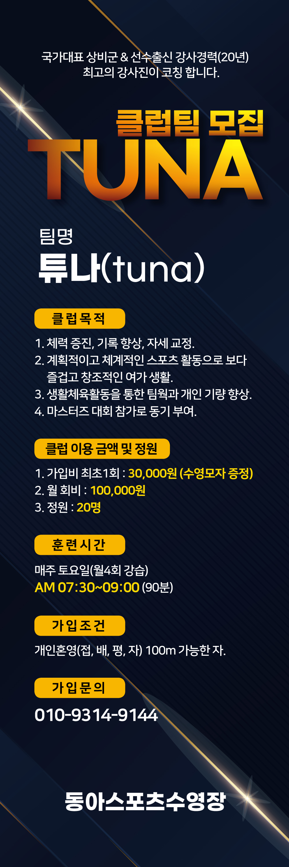 선수출신 강사경력(20년) 강사진이 코칭하는 동아스포츠수영장 클럽팀 'TUNA' 모집 중입니다. 가입 문의는 이미지 사진 속 번호를 참고해주세요.